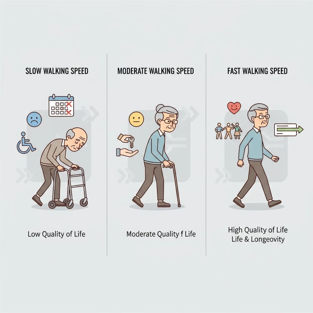 کیفیت زندگی در سالمندان مفهومی چندبعدی است که شامل استقلال عملکردی، مشارکت اجتماعی، سلامت روان، کنترل علائم و احساس معنا در زندگی میشود. شواهد نشان میدهد که کاهش سرعت راه رفتن با پیامدهای زیر همراه است: